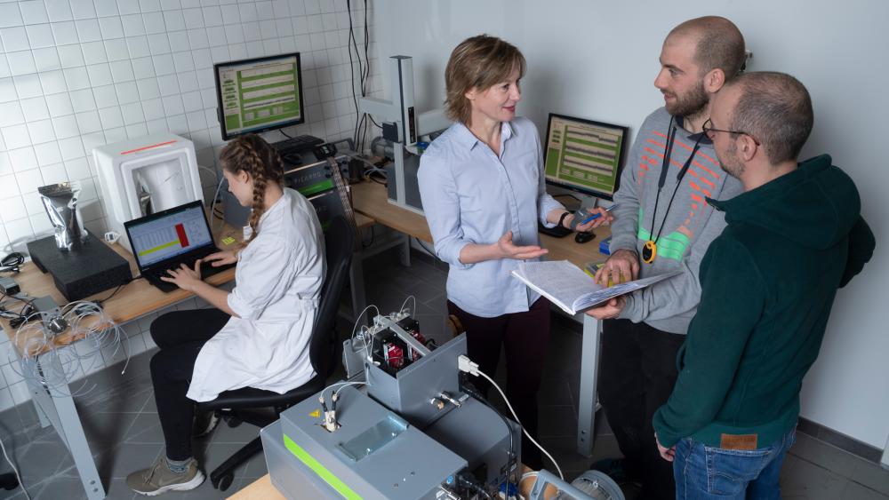 Professor Dörthe Tetzlaff (in the centre) with team colleagues in the isotope laboratory at IGB. | Photo: David Ausserhofer