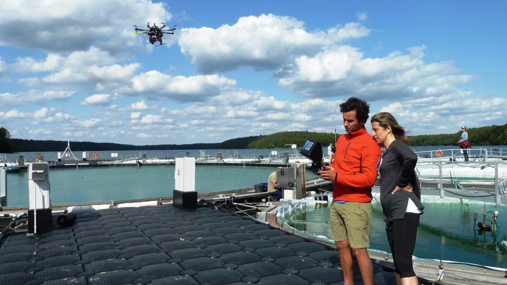 "We are really lucky that we have the chance to participate in this year's LakeLab experiment," says Carmen Cillero Castro and adds: "Here we can examine 25 water bodies with different water qualities in a confined space and may furthermore access all data collected by other teams during the experiment." With the 25 water bodies, the Spanish remote sensing specialist means Lake Stechlin plus the enclosures of the LakeLab, literally 24 lakes in the lake. She and her colleague, Federico Cheda, characterize the various water bodies from above with a drone (see photo above) which is particularly advantageous when clouds prevent data acquisition from satellites. Their drone is loaded with 3 different multispectral and hyperspectral sensors and enables them, for example, to detect and quantify harmful algal blooms in drinking water reservoirs at an early stage.