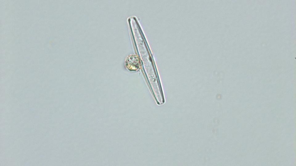 Alga with an infection that is almost matured (the circle in the image). Inside the infection, zoospores are visible (the small green spot) that will soon be released into the water, ready to find new algae to infect. | Photo: Thijs Frenken