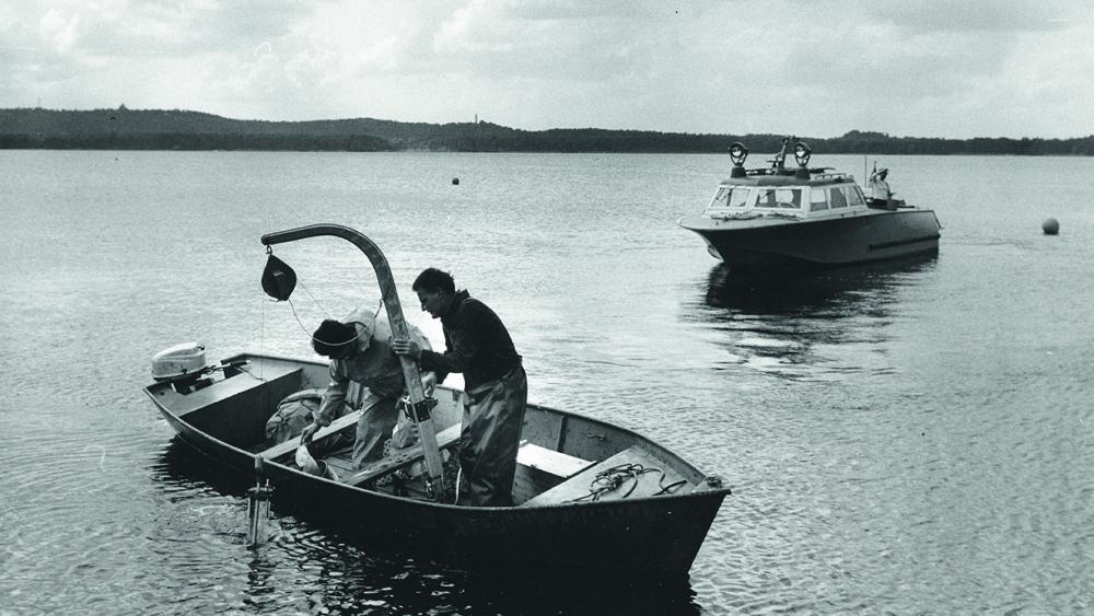 IGB-Wissenschaftler bei der „Montagsprobenahme“ auf dem Müggelsee im Herbst 1980, die Grundlage der heute wissenschaftlich wertvollen Langzeitdatenreihe des Sees war. | Foto: Archiv IGB