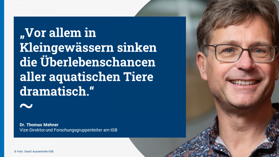 Nun, es gibt Arten, denen die Veränderungen der Gewässer – wie zum Beispiel wärmere Temperaturen – tatsächlich nichts ausmachen, die sogar davon profitieren können, wie beispielsweise viele Arten aus der Gruppe der Karpfenfische, deren ursprüngliche Evolution in wärmeren Gebieten von Europa und Asien stattgefunden hat. Andere Arten wiederum brauchen als Lebensraum kaltes und sauerstoffreiches Wasser – wie beispielsweise die Maränen und viele Arten aus der Gruppe der Lachsartigen, welche bevorzugt in tiefen Seen vorkommen. Diese Arten sind durch die globale Erwärmung der Seen bedroht. In Kleingewässern kommen allerdings viele Faktoren zusammen. In vollständig ausgetrockneten Tümpeln und Gräben kann kein Fisch mehr leben. Aber auch wenn eine geringe Menge an Wasser am Grund dieser Gewässer verbleiben sollte, erwärmt sich dieses Wasser sehr stark, der Sauerstoffgehalt sinkt, die Konzentration von Nähr- und Schadstoffen steigt, und somit sinken die Überlebenschancen aller aquatischen Tiere, einschließlich der Fische, dramatisch.